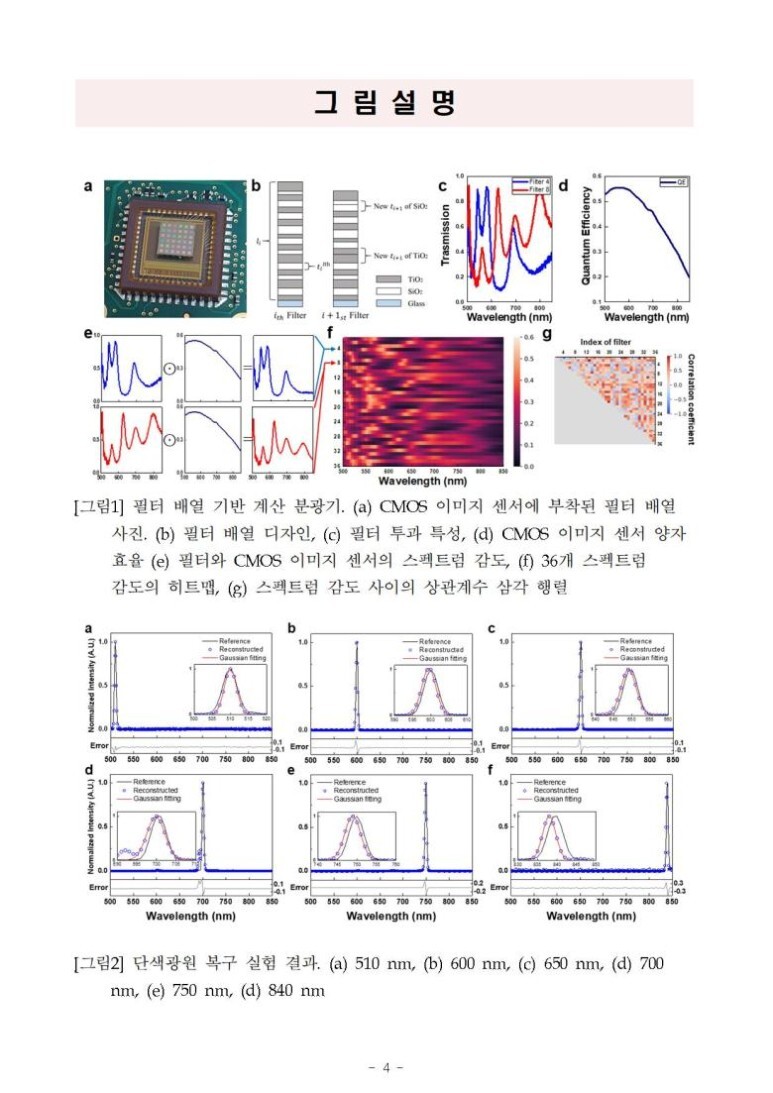 □ 연구팀은 특정 파장 범위의 빛만 투과하도록 제작되는 밴드패스 형태의 광학 필터와 달리, 하나의 광학 필터가 여러 파장 영역의 빛을 감지하도록 설계/제작했다. 이러한 필터 36개를 배열 형태로 만들었으며, 이 배열을 CMOS 이미지 센서 위에 부착하여 500 – 850 nm 파장 대역의 빛의 세기를 측정하는데 성공했다.