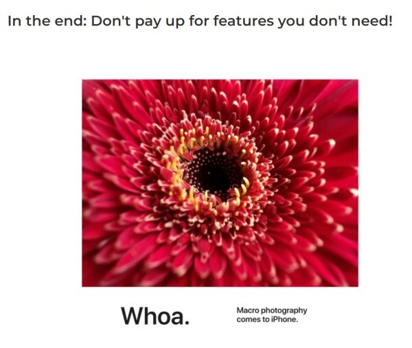 오해하지 마세요... 매크로 모드는 매일 꽃과 벌을 클로즈업하는 경우 유용한 카메라 트릭입니다. 당신의 직업이 "벌과 꽃 클로즈업 사진가"라면. 그렇다면 좋은 매크로 모드가 있는 전화기에 추가 비용을 지출할 가치가 있습니다.