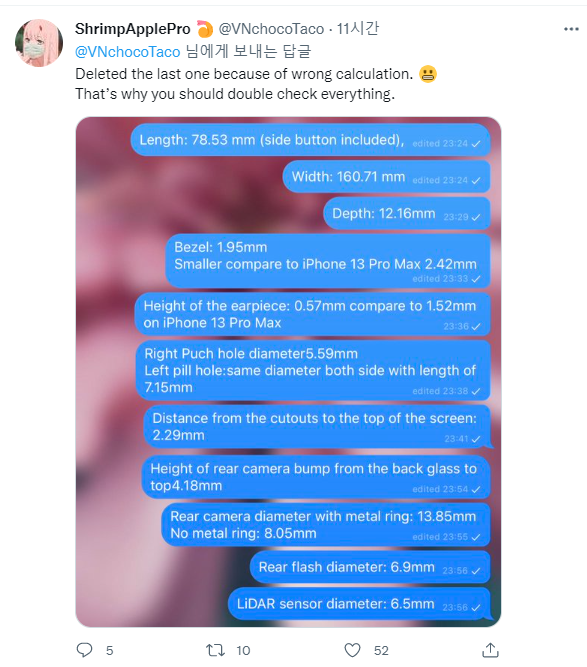 그의 정보에 따르면 아이폰 14 프로 맥스의 베젤은 1.95mm로 아이폰 13 프로 맥스의 2.42mm에 비해 더 좁아진다고 하며 새로운 듀얼 펀치홀과 폰의 길이와 폭, 카툭튀 등 다른 치수 등도 구체적으로 언급했습니다.