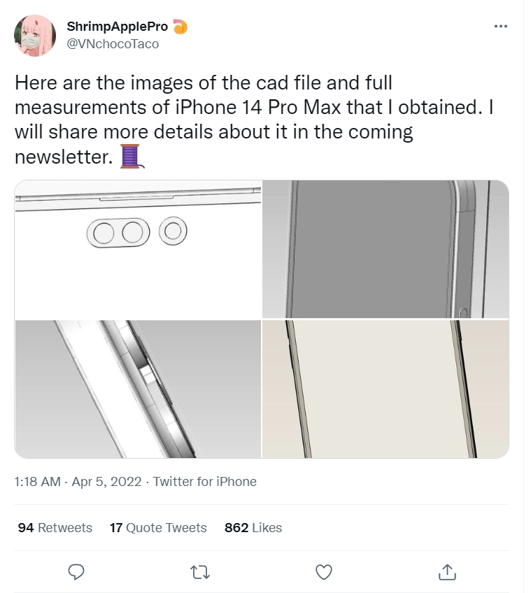 애플 정보 유출가 및 IT 트위터리안 ShrimpApplePro@VNchocoTaco는 트위터에 그가 새로 입수한 아이폰 14 프로 맥스 CAD 렌더링 을 게시했습니다.