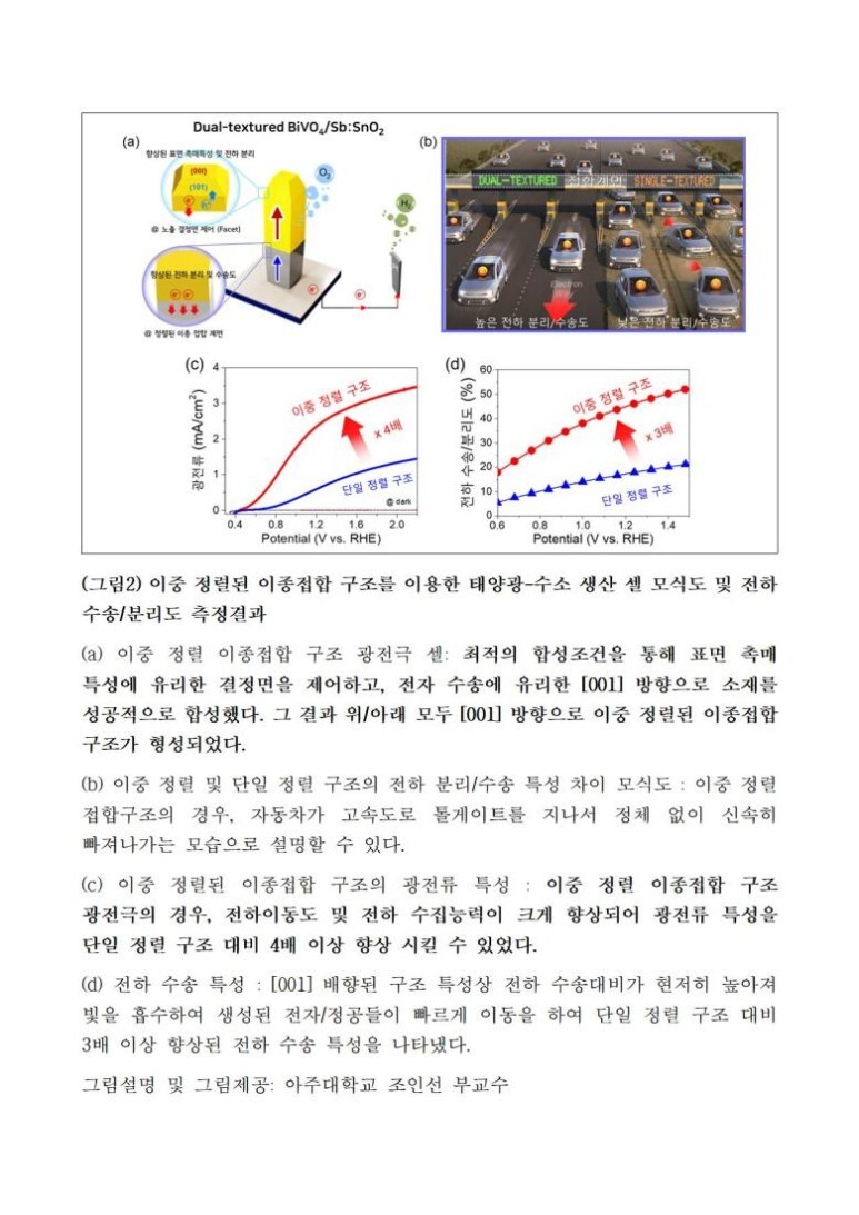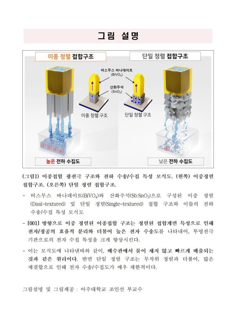 □ 한국연구재단(이사장 이광복)은 조인선 교수(아주대학교, 제1저자 정유재), 한현수 박사(스탠포드대학교) 연구팀이 이중 정렬*된 이종접합 광전극 구조를 제안, 단일 정렬된 광전극 대비 4배 이상 높은 태양광-수소 전환 효율을 갖는 광전극 구조를 개발했다고 밝혔다.