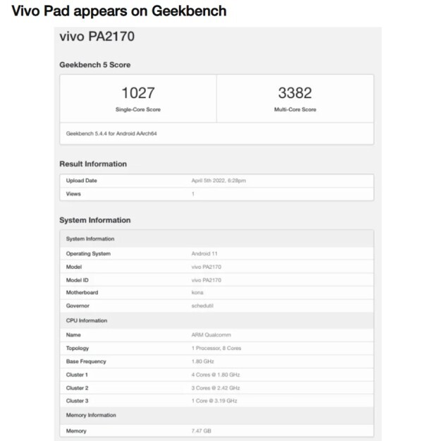 - Vivo Pad는 모델 번호 PA2170으로 Geekbench에 나타났습니다.