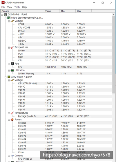 아래 화면은 일반적인 PC 상태에서의 온도 상태입니다.