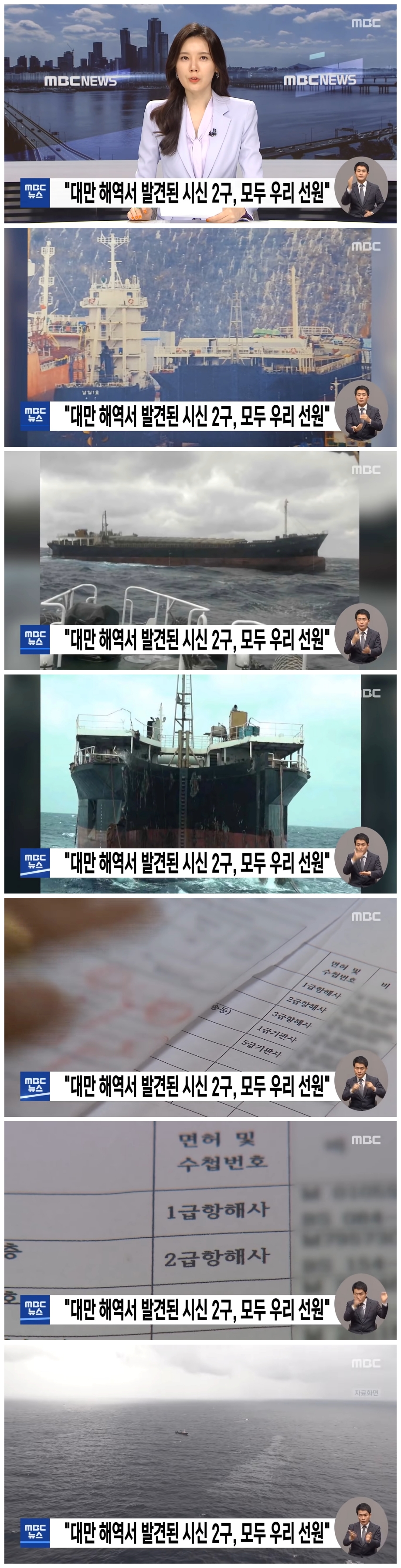한국인 선원 6명을 태운 선박이 대만 해역에서 실종된 사건이 발생한 가운데, 인근 해역에서 발견된 두 구의 시신이 모두 실종된 배에 탑승했던 선원인 것으로 확인됐습니다.