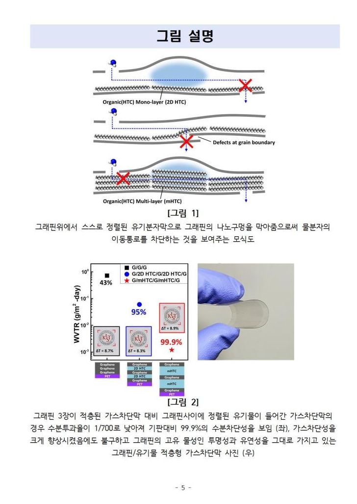 연구팀은 그래핀을 대면적으로 합성하는 과정에서 발생하는 나노구멍으로 가스차단 효과가 떨어지는 문제를 해결하기 위해 긴 체인구조를 가지는 유기물질들이 그래핀 표면위에서 스스로 정렬하여 유기박막을 형성하는 자기조립 현상을 이용하였다. 유기박막이 가스분자가 유입되는 이동통로인 그래핀의 나노구멍을 막아줌으로써 수분투과율을 기존 그래핀 가스차단막의 1/700 수준으로 낮추었다. 또한 유기박막의 두께를 나노미터 수준으로 제어함으로써 차세대 디스플레이 가스 차단막에 필요한 물성인 투명성과 유연성을 그래핀에서 유지할 수 있었다.