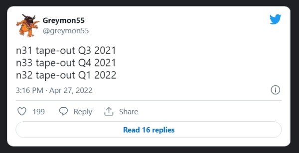 이것은 양산되는 마지막 Navi 3X 부품이 될 것입니다. Greymon55에 따르면, 이 특정 SKU는 2021년 마지막 분기에 녹화되었으며, 이는 대량 생산이 지금 언제든지 시작되어야 함을 의미합니다. RX 7800 XT 는 2023년 초에 출시될 예정입니다.