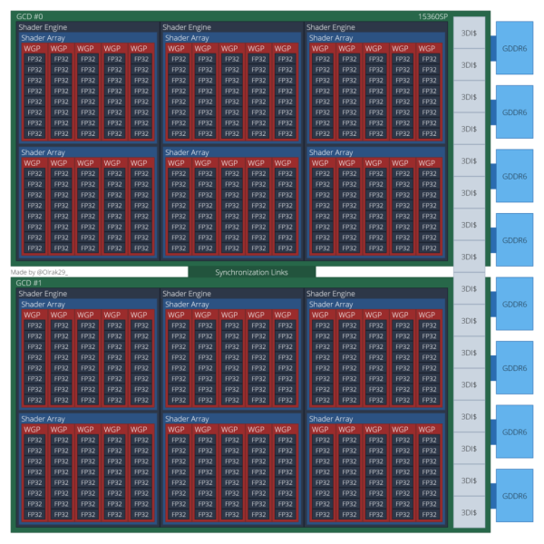 각 다이는 6개의 셰이더 어레이와 3개의 셰이더 엔진에 걸쳐 7,680개의 스트림 프로세서(코어)로 구성됩니다.