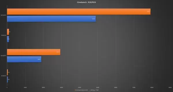 다중 스레드 테스트에서 52코어 Sapphire Rapids 부품은 AMD의 단일 소켓 서버 제품 중 최상위에 있는 64코어 1S CPU인 Epyc 7720p를 없애줍니다. Cinebench R23에서 전자는 후자보다 60% 더 빠르며 R20에서는 64코어 Milan을 50-60% 능가합니다.