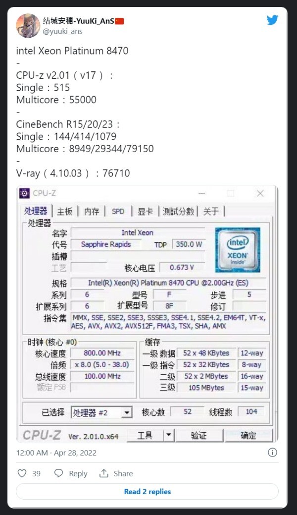 중국 정보 제공자 YuuKi_AnS는 AMD의 기존 Epyc Milan 부품과 비교할 52코어 SPR SKU인 Xeon Platinum의 여러 벤치마크를 공유했습니다.