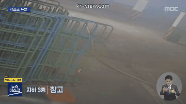입구를 비춘 폐쇄회로 화면이 떨리더니 종이들이 옆으로 날리고 벽재가 기울어집니다.