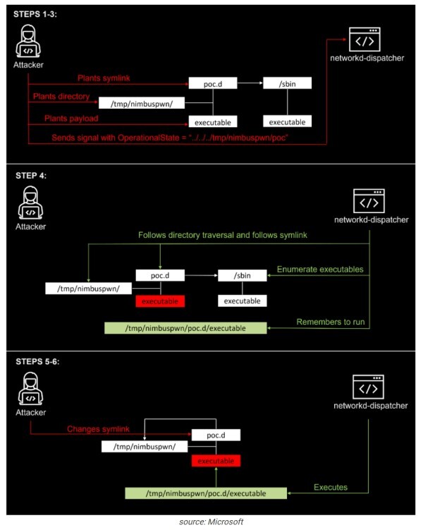 CVE-2022-29799 및 CVE-2022-29800으로 추적되는 Nimbuspwn 보안 문제는 Linux 시스템에서 연결 상태 변경을 전송하는 구성요소인 networkd -dispatcher 에서 발견되었습니다.