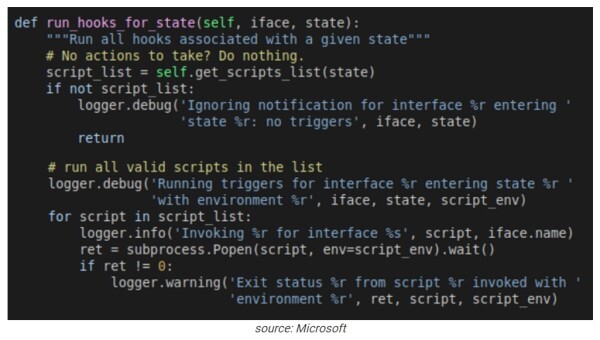 연구원은 데몬이 " _run_hooks_for_state" 라는 메서드를 사용 하여 감지된 네트워크 상태에 따라 스크립트를 검색하고 실행하는 것을 알아냈습니다.