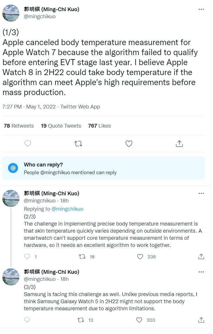 Ming-Chi Kuo는 트위터를 통해 애플이 당초 애플워치 시리즈 7 모델로 체온 측정 기능을 제공하려 했으나 지난해 이 기기가 엔지니어링 검증 테스트(EVT) 단계에 들어가기 전 개발한 체온 알고리즘이 요건을 충족하지 못하자 계획을 보류했다고 설명했다.
