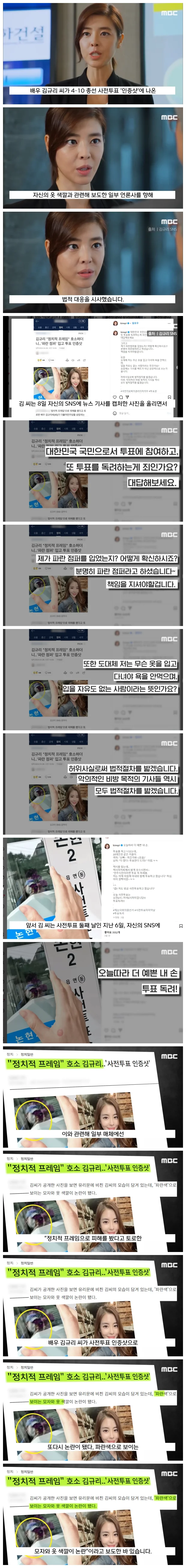 배우 김규리 씨가 4·10 총선 사전투표 '인증샷'에 나온 자신의 옷 색깔과 관련해 보도한 일부 언론사를 향해 법적 대응을 시사했습니다.