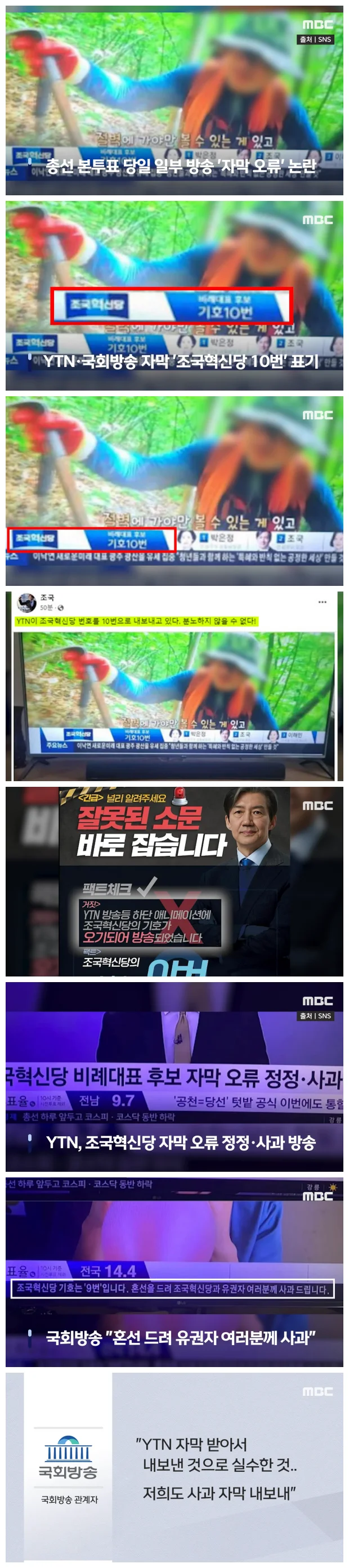 오늘 오전 YTN과 국회방송은 TV 화면 아래쪽에 총선 비례대표 후보와 정당기호를 소개하는 자막을 내면서 한때 기호 9번인 조국혁신당을 기호 10번으로 표기했습니다.