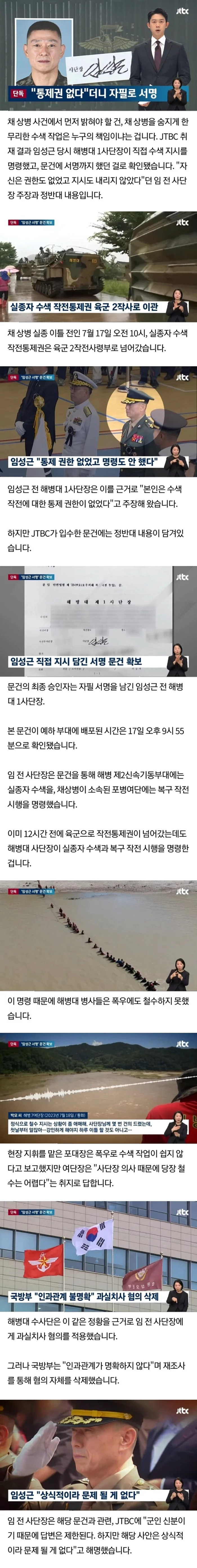 JTBC 취재결과 임성근 당시 해병대 1사단장이 직접 수색 지시를 명령했고, 문건에 서명까지 했던 걸로 확인됐습니다.