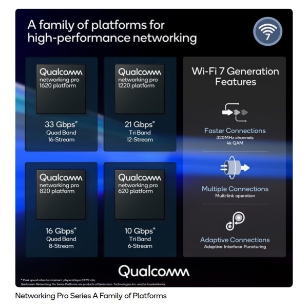 - Qualcomm Networking Pro 820: 엔터프라이즈, SMB, 프로슈머 및 프리미엄 홈 메시 시스템을 위한 쿼드 밴드, 8스트림, 13.7Gbps 피크 무선 용량.
