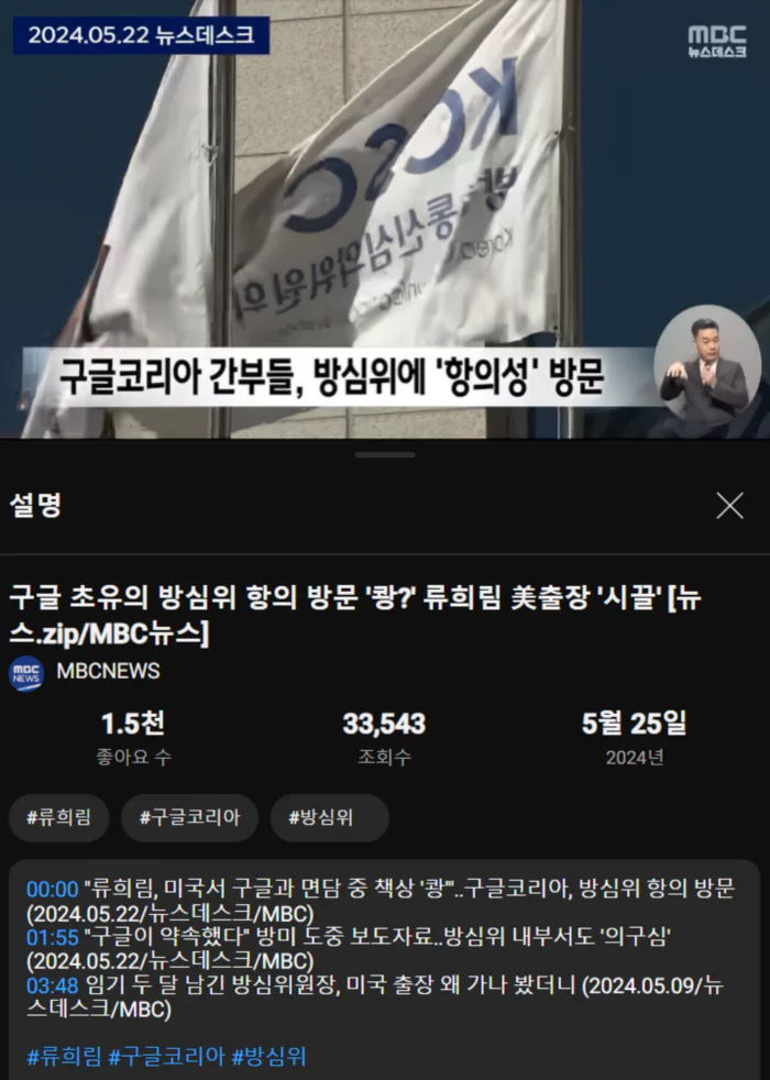 지난주 워싱턴d.c에서 구글 측 인사들을 만난 류희림 방심위원장이 사전 협의되지 않은 질문을 던진 이유와 면담 직후 낸 관련 보도자료의 내용 등을 확인한 것으로 전해졌습니다.