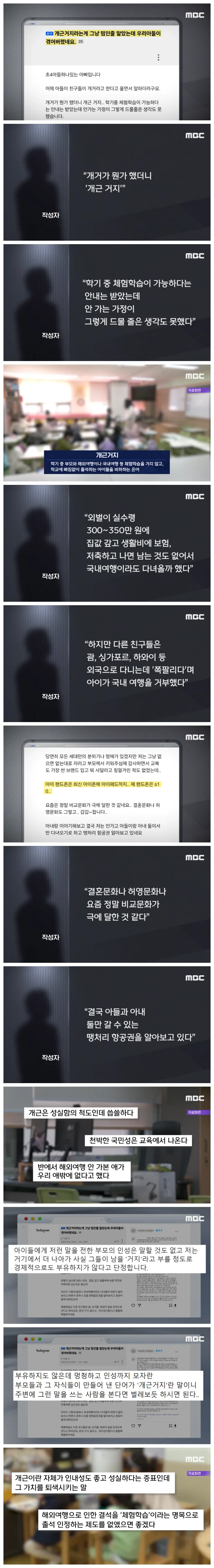 초등학교 4학년 아들이 있다는 작성자는 "개근거지라는게 그냥 밈인줄 알았는데 우리아들이 겪어 버렸네요"라는 제목의 글에서 아들이 "친구들이 개거라고한다"고 울면서 말했다고 전했습니다.