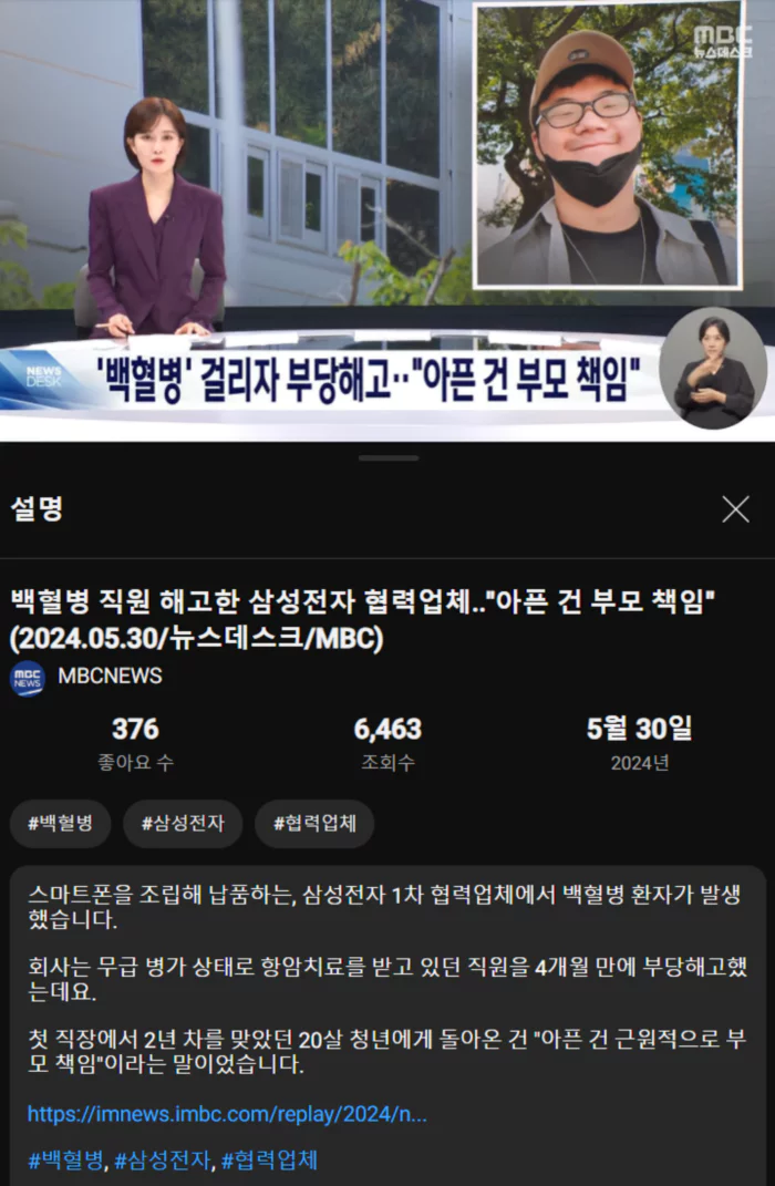 백혈병 직원 해고한 삼성전자 협력업체.. "아픈 건 부모 책임"