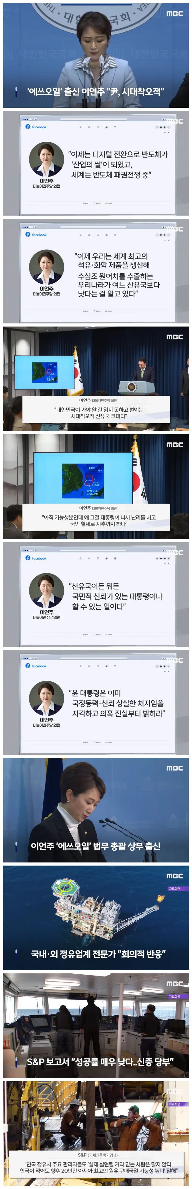 정유회사 '에쓰오일' 상무 출신인 이언주 더불어민주당 의원이 '포항 영일만 석유·가스 매장 가능성'을 직접 발표한 윤 대통령을 겨냥해 '시대착오적'이라고 직격했습니다.