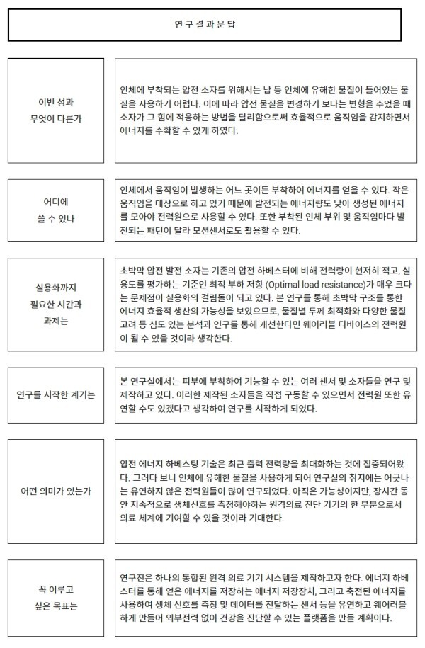 원격 의료 진단용으로 사용되는 웨어러블 디바이스는 기기의 용도에 최적화할 수 있도록 장시간 동안 문제없이 에너지를 공급할 수 있는 에너지 공급원이 필요하다. 압전 발전 소자는 인간의 움직임을 이용하여 전기 에너지를 만들어낼 수 있어 미래의 에너지원 중 하나로 주목받고 있다. 이러한 웨어러블 에너지 발전 소자는 미세한 인체 또는 피부 움직임에도 쉽게 변형이 되어야 하며, 이는 일상적인 움직임에도 지속적으로 전기를 발전할 수 있게끔 한다. 그러나, 현재 연구가 진행되었던 압전 발전 소자들은 작은 움직임에 효율적으로 반응 및 변형을 하기가 어려우며, 결국 피부에 부착된 상태일 때에는 그렇지 않을 때보다ㅣ 에너지 전환 효율이 급격하게 하락하는 문제점이 발생한다.