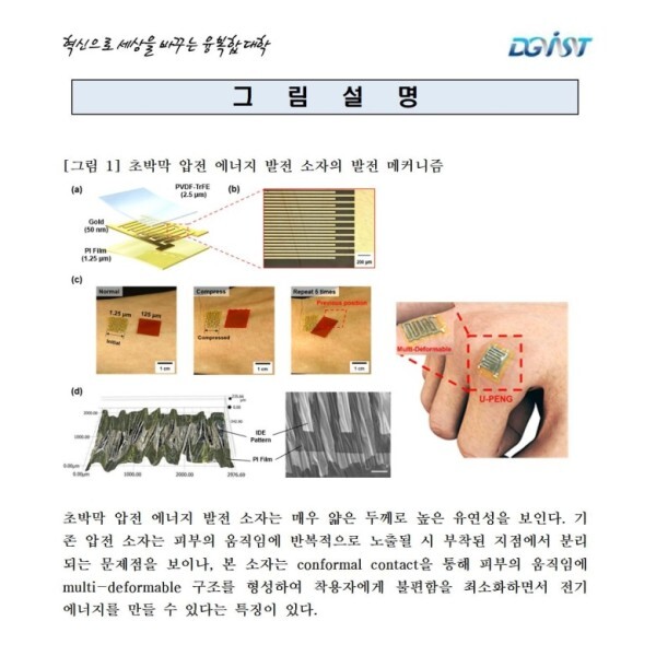 □ DGIST 화학물리학과 이성원 교수는 “초박막을 기반으로 한 본 에너지 발전 소자는 동일한 조건의 두꺼운 기판의 소자보다 효율이 10배 정도 증가하였다”며 “초고효율의 발전소자로 인체의 작은 움직임에서 발생되는 에너지로 장시간 생체 신호를 측정하는 센서에 전원을 공급할 수 있는 신개념 에너지 소자로 무겁고 단단한 배터리를 대체할 가능성을 보여주는 잠재력이 매우 큰 연구다.”고 말했다.