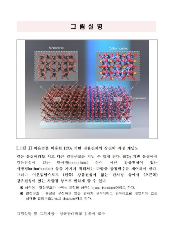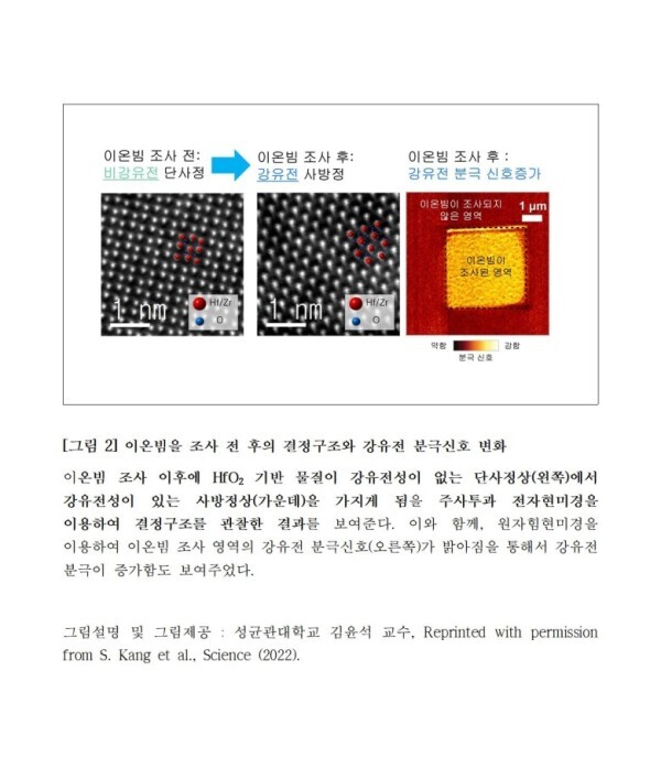 □ 과학기술정보통신부(장관 이종호, 이하 ‘과기정통부’)는 김윤석 교수(성균관대학교) 연구팀*이 차세대 반도체 소재로 주목받고 있는 하프늄옥사이드(HfO2)에 ‘이온빔’을 이용해서 강유전성을 획기적으로 향상시킬 수 있는 방법을 세계 최초로 구현했다고 밝혔다.