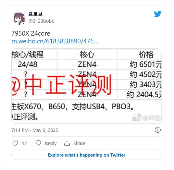 AMD Ryzen 9 7900X는 상위 SKU에서 발생하는 상황에 따라 16개 또는 12개의 코어로 끝날 수 있습니다. 이 칩은 최대 5.3GHz의 단일 코어 부스트 클럭을 특징으로 하며 Ryzen 9 5900X 12 코어 칩의 기존 미국 가격 549달러에 가까운 약 4502달러 또는 650달러의 가격이 될 것이라고 합니다. 성능 면에서 12개의 Zen 4 코어는 성능이 크게 향상되고 클럭 속도가 높을수록 성능 스펙트럼이 15-25% 향상됩니다.