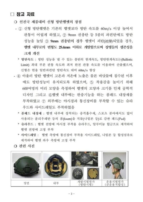 □ 방탄 헬멧은 다양한 작전 환경에서 적의 위협으로부터 장병의 생명을 지키고 전투 활동성을 높이기 위해 최대한의 방탄성능은 물론 최소한의 무게로 착용편의성을 갖춰야한다. 이번에 민·군 기술협력 사업으로 개발된 신형 방탄 헬멧은 미국 등 선진국 제품보다 동등 이상의 성능을 보유하고 있는 것으로 평가된다.(제품 특성 : 아래 <참고자료> )