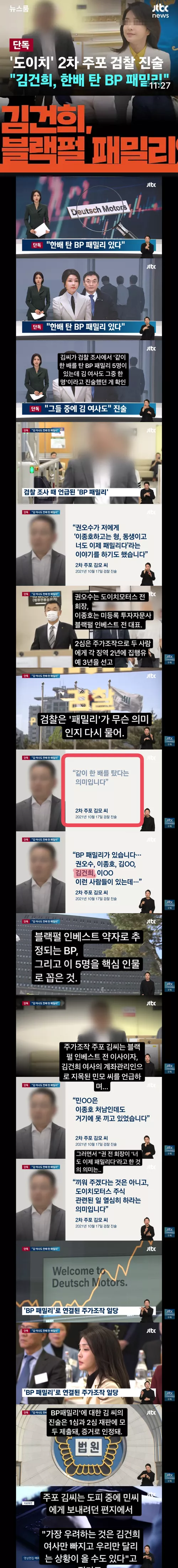 김씨가 검찰 조사에서 '같이 한 배를 탄 BP 패밀리 5명이 있는데 김 여사도 그중 한 명'이라고 진술했던 게 확인된 겁니다.