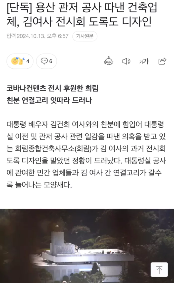13일 국회 행정안전위원회 양부남 의원(더불어민주당)이 확보한 자료에 따르면 희림은 2016년 전시기획사 코바나컨텐츠가 기획한 르 코르뷔지에전의 전시 도록 디자인을 전담한 것으로 나온다. 코바나컨텐츠는 김 여사가 운영했던 회사다. 김 여사는 전시회 당시 총감독으로 이름을 올렸다.