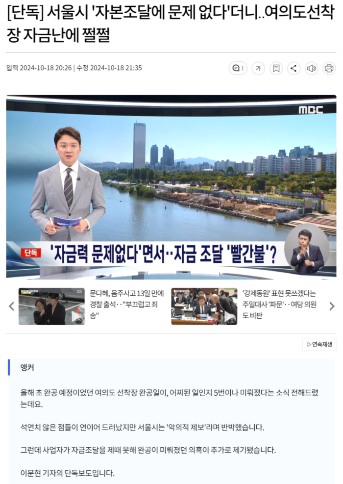 여의도 선착장 사업을 개인 자격으로 단독 입찰해 수주한 김 모 씨는 당초 서울시에 2023년 말까지 사업비 236억 원을 확보하겠다고 했습니다.