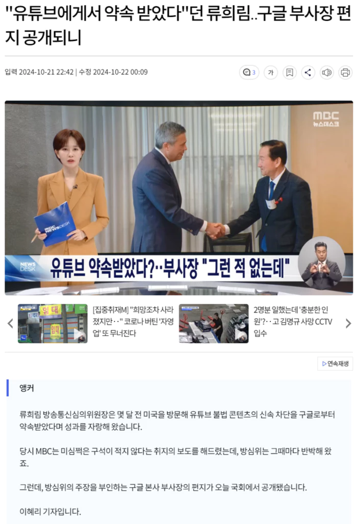 이후 구글코리아 간부 2명이 방심위를 항의 방문해 "유튜브 관련 이슈는 협의된 게 없다"고 말했다고 알려졌습니다.