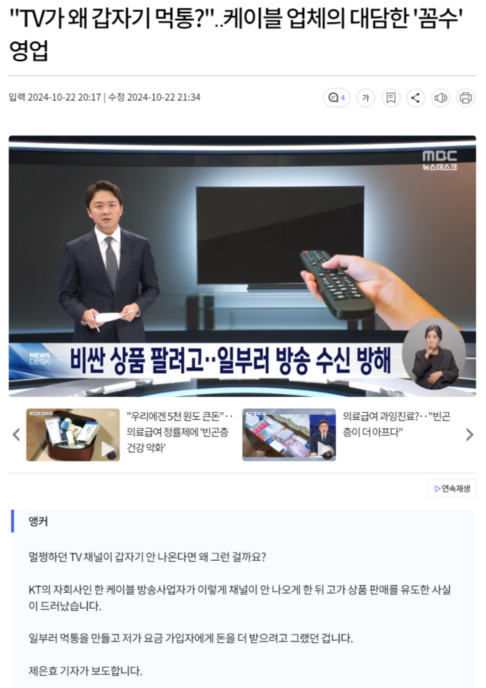 "예고도 없이 지상파 방송만 나오는 거예요. 케이블 많이 보는데. 갑자기 안 나오니까 황당한 거지."