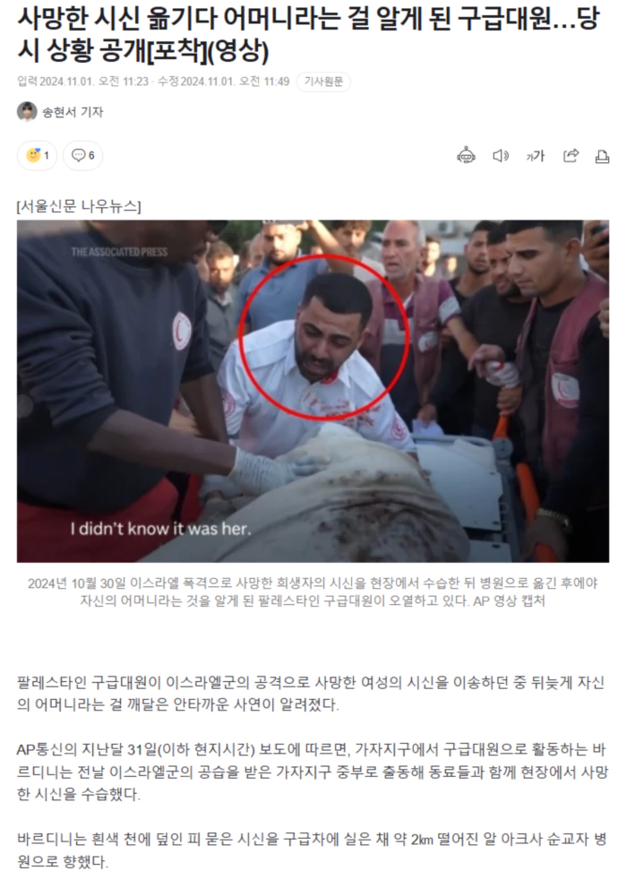 병원에 도착한 그는 시신이 실린 들것을 내리고 시신을 병원 안치실로 이동했고, 안치실에서 병원 의료진이 신원 확인을 위해 흰색 천을 내렸을 때에야 자신이 수습한 시신이 어머니라는 것을 뒤늦게 알게됐다.