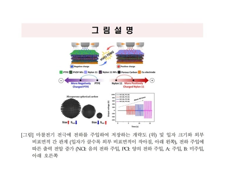 ∘ 연구팀은 다공성 탄소*의 외부 비표면적**이 클수록 전하를 잘 붙잡고 작을수록 전하 이동이 빨라지는 현상을 이용해, 외부 비표면적을 변화시킨 다공성 탄소 세 종류를 적층하여 전하의 이동을 제어함으로써 마찰전기 저장 효율을 향상시켰다.