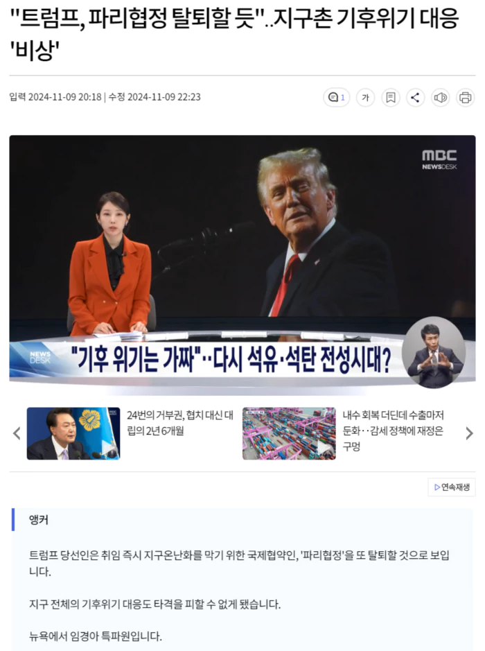 이후 바이든 대통령이 2021년 취임 직후 재가입했는데, 트럼프 당선인은 다시 탈퇴할 것으로 보입니다.