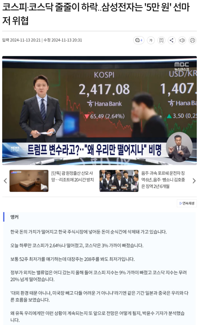 "(삼성전자의) 경쟁력에 대한 우려와 외국인들의 매도가 삼성전자에 집중이 되면서 다른 나라보다 낙폭이 크게 나타났습니다."