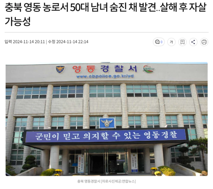 오늘(11/13) 오후 5시 반쯤 충북 영동군 추풍령면의 한 농로에서 50대 남녀가 숨진 채 발견됐습니다.