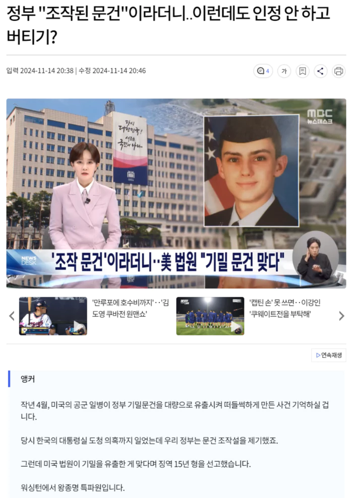 그로부터 1년 반 뒤, 미국 법원은 문건 유출자 테세이라 일병에게 국방 정보 소지, 유출 혐의 등을 적용해 징역 15년 형을 선고했습니다.