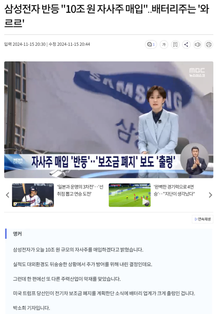 "최근에 주가가 4만 원대로 떨어지면서 삼성전자의 위기론 자체를 더 부추기는 이러한 모습에서 삼성전자가 적극적으로 주주가치 방어에 나선 부분들이 아닌가 보고 있습니다."