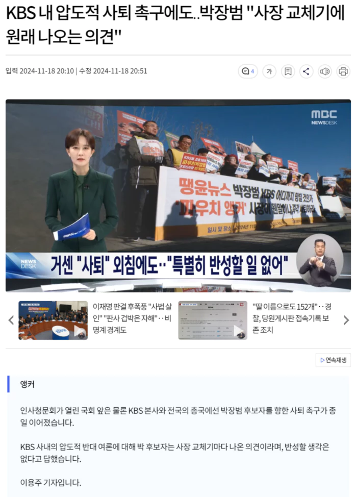"온 국민의 뇌리 속에 각인돼 있는 '파우치 앵커', 그 한마디만으로도 박장범은 이미 대한민국 공영방송 KBS의 사장 자격을 스스로 잃었습니다."
