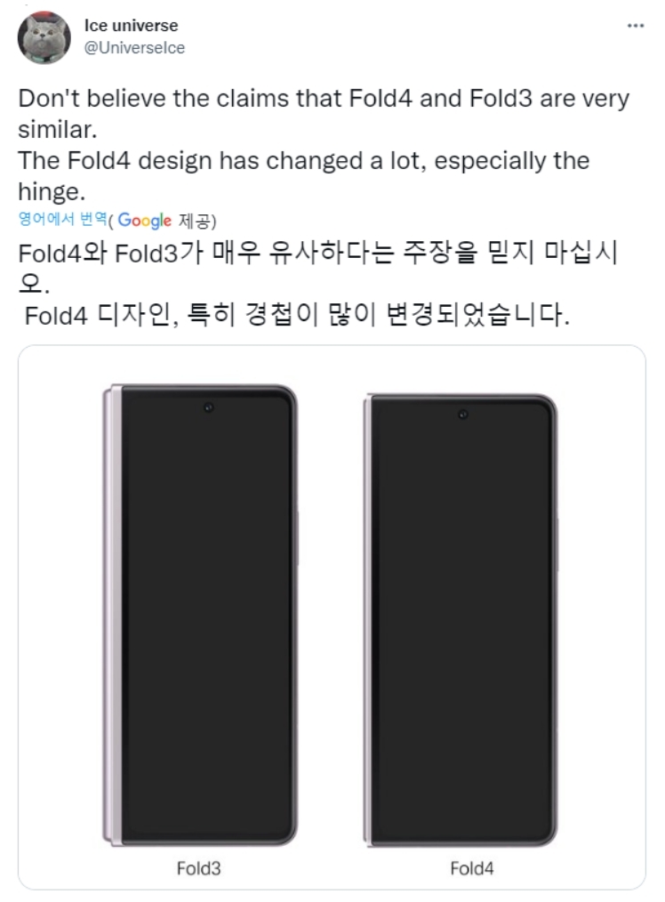 IT 트위터리안 Ice universe는 갤럭시 Z 폴드 4 디자인이 전작 폴드 3와 매우 유사하다는 주장은 잘못 되었다며, 특히 경첩((hinge) 부분이 많이 변경되었다고 트위터를 통해 알려..