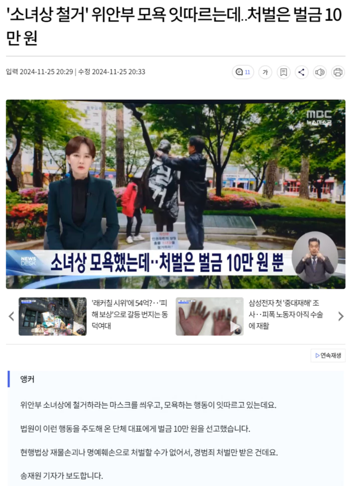 위안부 강제 동원을 부정하며 위안부 피해자들을 모욕하는 행동이지만, 현재 법으로는 소녀상을 물리적으로 파손한 게 아니라 재물손괴죄도 적용하기 어렵고, 소녀상이 사물이다보니 명예훼손죄로도 처벌하기가 어렵습니다.