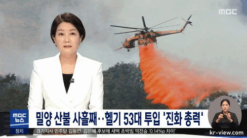 그제 오전 경남 밀양시 부북면 옥교산에서 시작된 산불이 사흘째 이어지고 있는데요, 오늘은 바람이 초속 1미터 정도로 잠잠해 지면서 진화헬기가 집중 투입돼 주불 진화에 나선 겁니다.