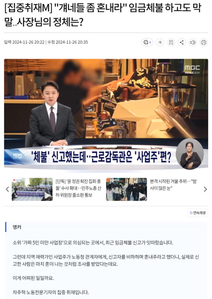 "'저 초과 수당이랑 야간 수당이랑 그런 거 다 못 받았어요' 그러니까 '5인 미만 아니에요? 5인 미만이잖아요'."