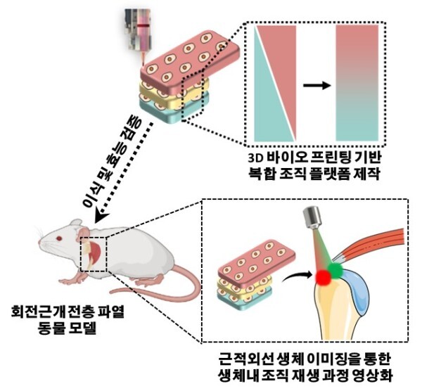 기계공학과 조동우 교수·채수훈 박사, IT융합공학과 장진아 교수·통합과정 용의중 씨 연구팀은 미국 하버드의대 최학수 교수와의 공동연구를 통해 파열된 회전근개를 되살릴 수 있는 복합 조직 플랫폼을 개발했다. 조직 특이적인 세포외기질 기반의 바이오잉크를 3D 바이오프린팅해 만들어지는 이 플랫폼은 회전근개를 구성하는 조직의 복잡한 구조를 그대로 모사할 수 있다.