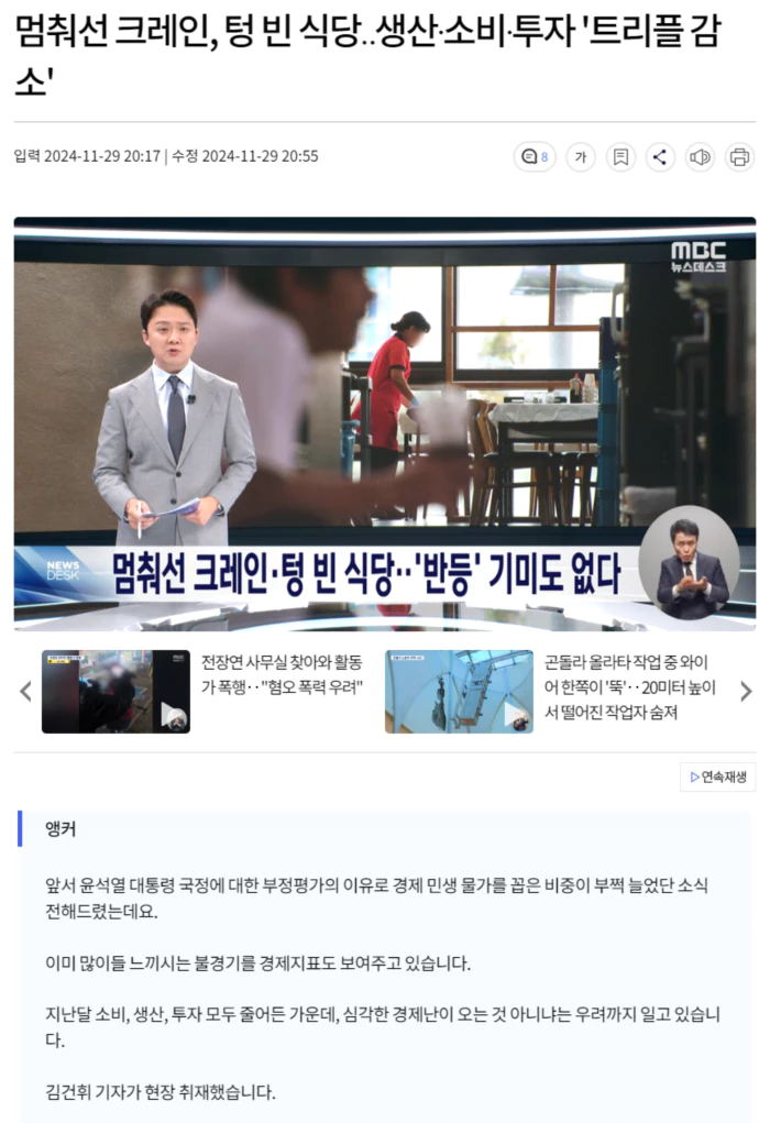 | 생산·소비·투자 ‘트리플’ 감소.. 짙어진 한국 경제 먹구름 (24) | 2024.11.29 |