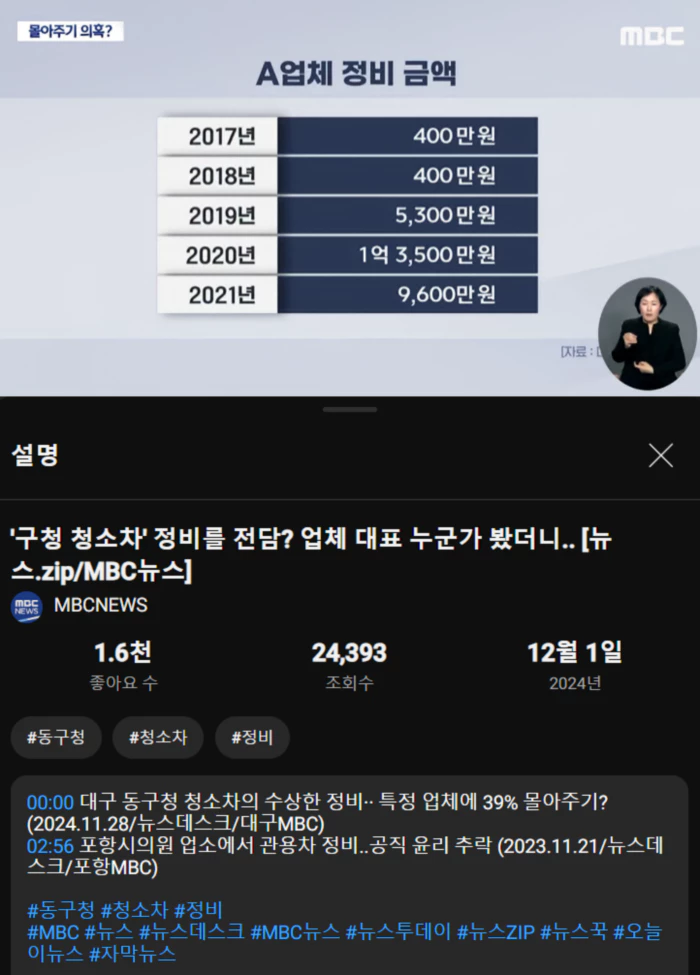 2021년까지 5년 동안 2억 9,000여만 원의 청소차 정비를 한 업체가 했습니다.